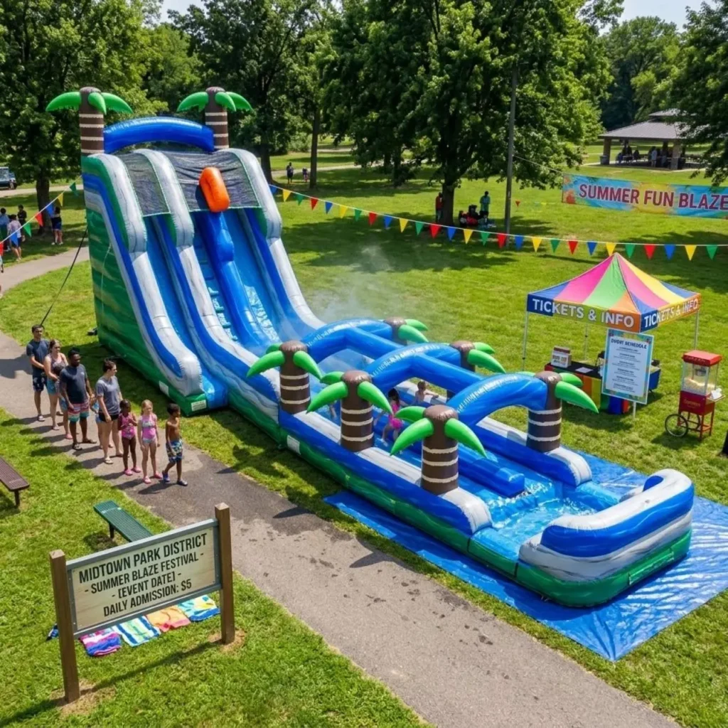 A 20-foot single-lane slide for a compact residential yard near Village Green Park has different clearance and water flow requirements than a 22-foot dual-lane tower for a corporate field day along Skokie Boulevard or an open event space at a Northbrook Park District venue on Techny Road. Jump Guy confirms slide footprint, platform clearance, and water source proximity against your lot specifications before dispatch. The slide that arrives is matched to your specific 60062 address.